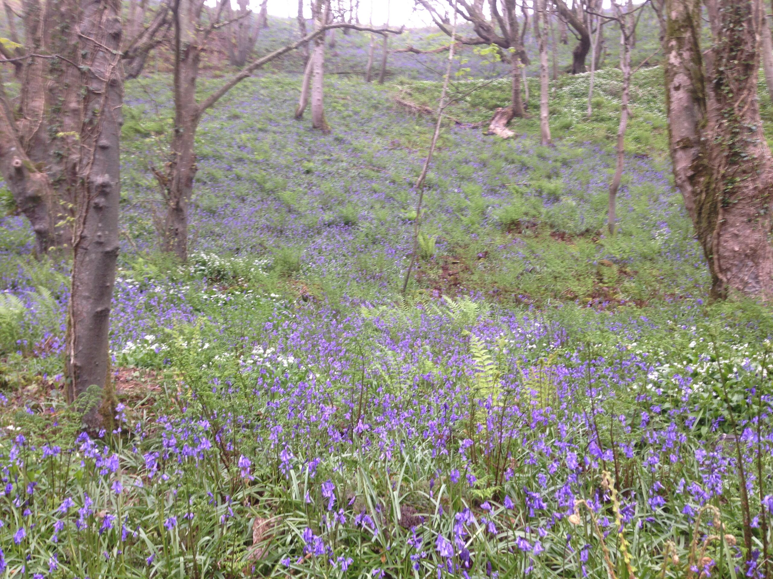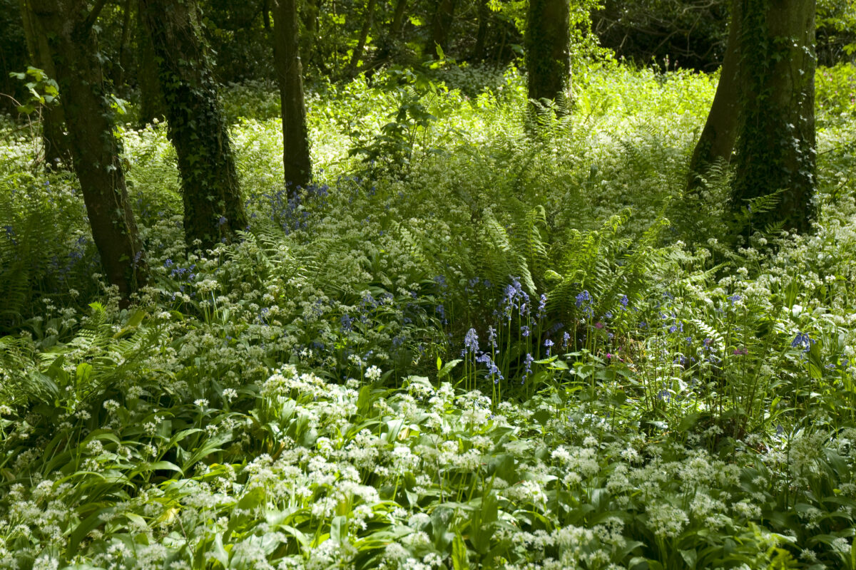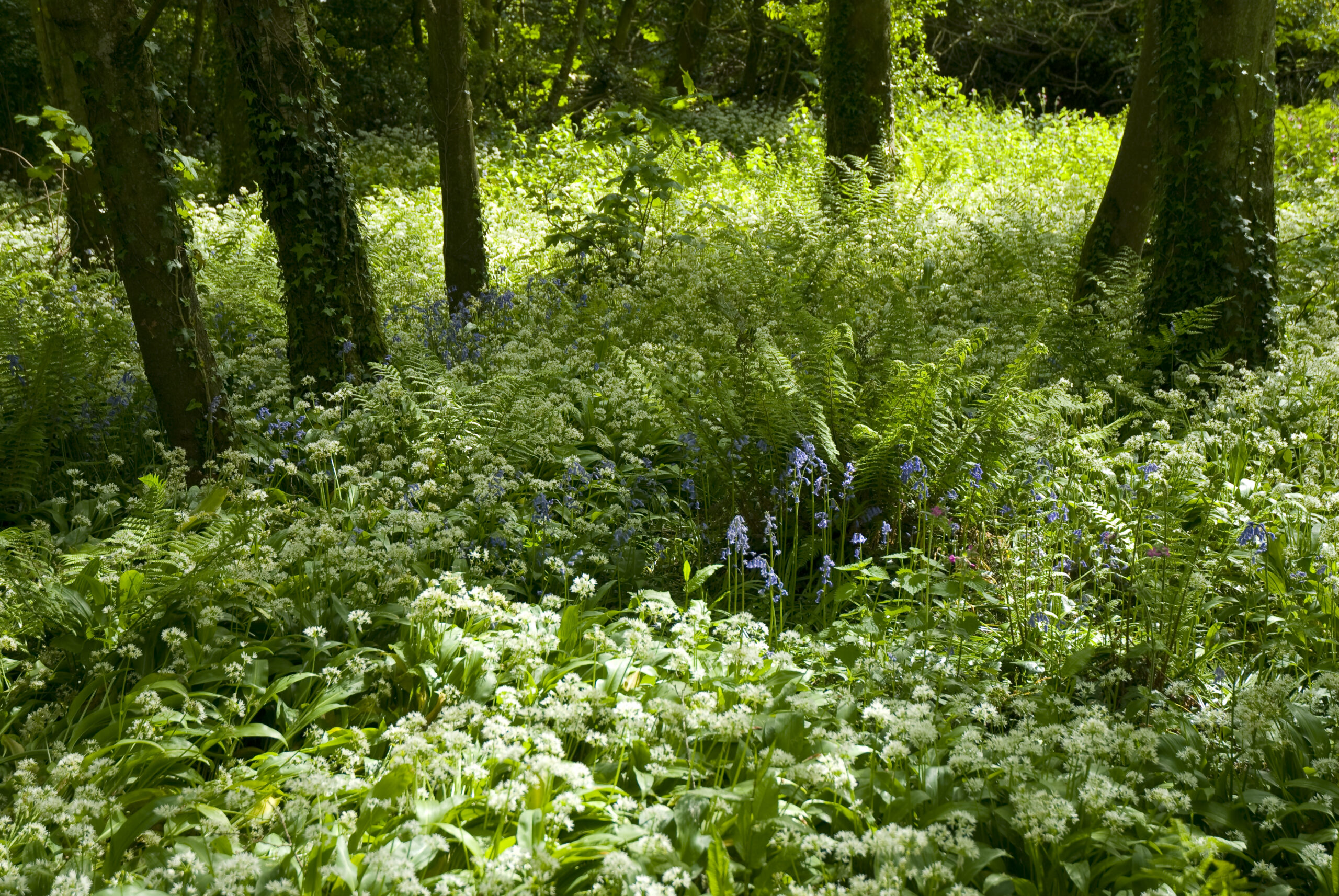 The ground is carpeted with bluebells and wild garlic, filling the air with a gentle scent. Early ferns begin to unfurl between the flowers, marking the arrival of the new season.